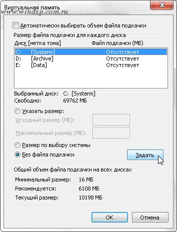 На рисунке видно, что выбрано "Автоматически выбрать объем файла подкачки". Снимаем галку, выбираем диск С, ставим Указать размер и прописываем Исходный и Максимальные размеры одинаковые, в моем случае это 6108 Мб. Жмем Задать и ОК